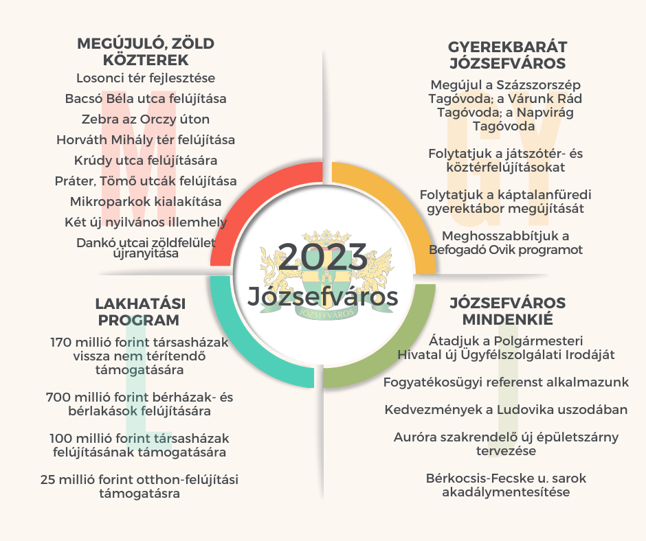- Gyerekbarát Józsefváros: új szakaszba lép a kerületi óvoda felújítási program (Százszorszép tagóvoda, Várunk Rád tagóvoda, Napvirág tagóvoda felújítása). Szintén folytatódnak a koncepcióhoz kapcsolódó közterületi beruházások: játszótér és közterületi fejlesztések.