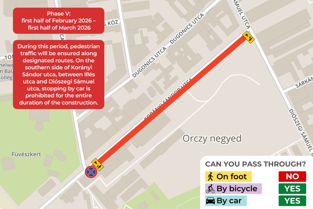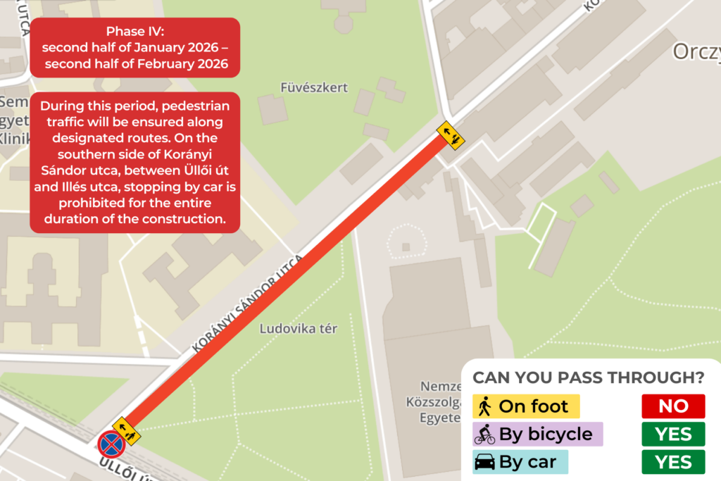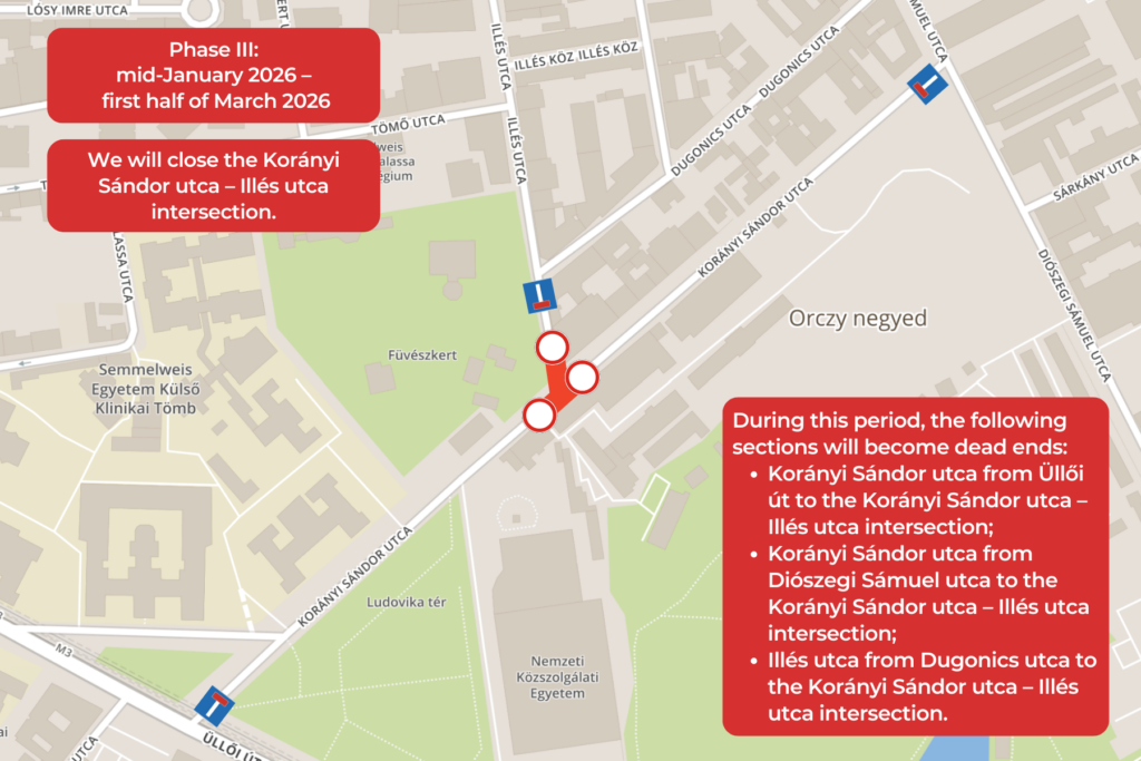 In this phase, construction begins at the Korányi Sándor utca – Illés utca intersection. During this period, the following sections will turn into dead ends: