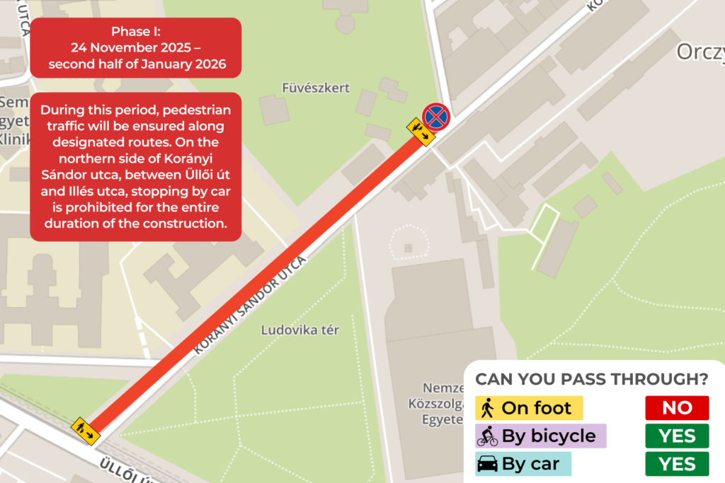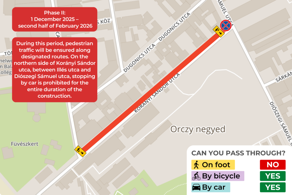 During the renovation of the sidewalks and curbs, car traffic can continue to use the roadway without restrictions. The only traffic change occurs during the construction of the intersection, when short sections of Korányi Sándor utca and Illés utca will temporarily turn into dead ends.