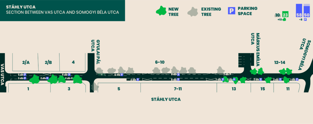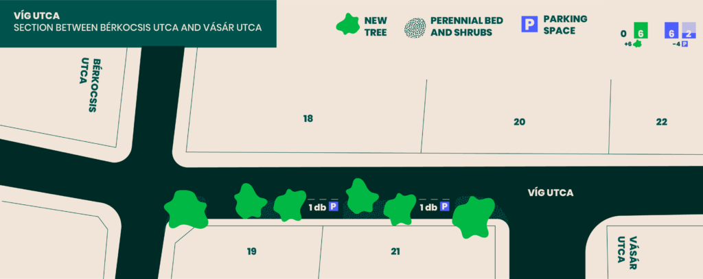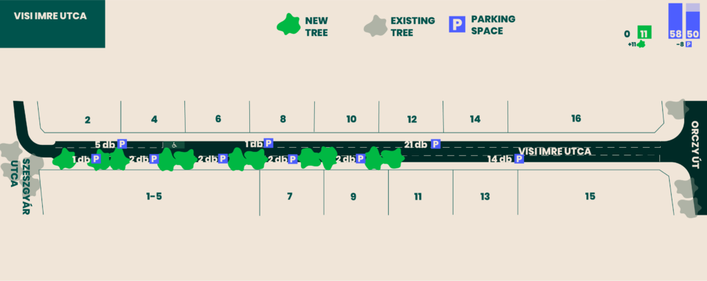As a result of the planned planting of nine trees, the number of parking spaces along this section of Bérkocsis Street will decrease from 52 to 47.