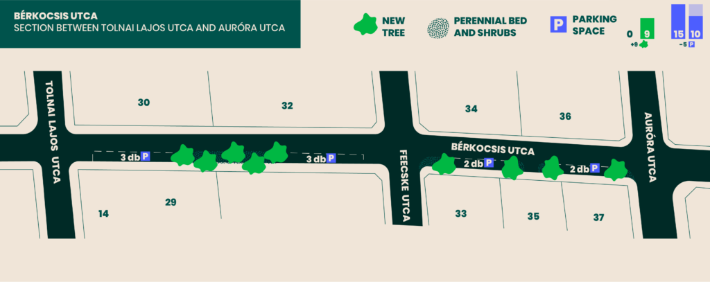 In Bérkocsis utca, the location of underground utilities makes tree planting particularly difficult. Without relocating utilities, trees can only be planted between Tolnai Lajos utca and Auróra utca.