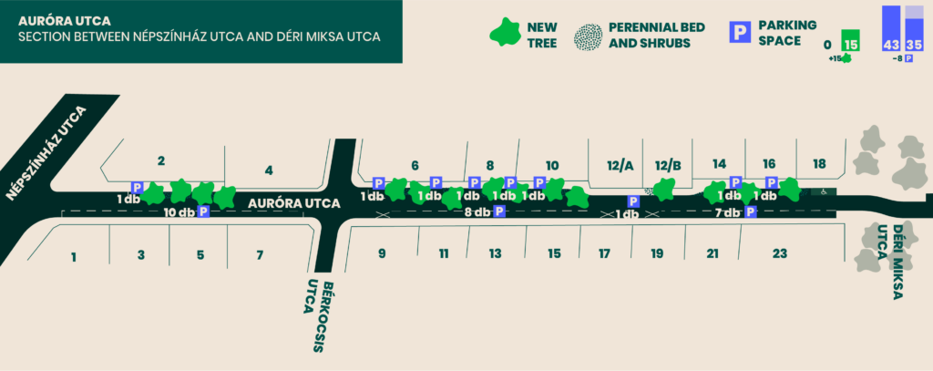 As a result of the development, 35 of the current 43 parking spaces will remain. To ensure the long-term maintenance of the trees, the plan also includes the installation of an irrigation network, achieved by extending the existing irrigation system on Déri Miksa utca.