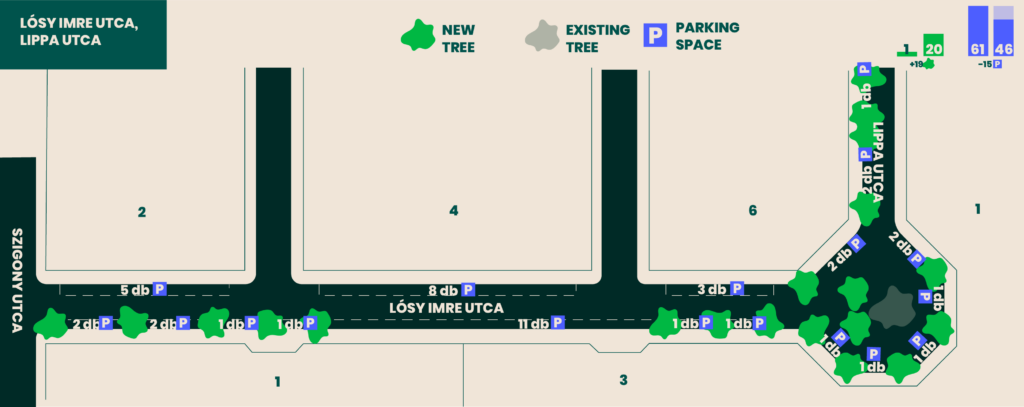 In these two streets—apart from the park-like green area of Molnár Ferenc tér—there is currently one tree located at the intersection of Lósy Imre utca and Lippa utca. This would be supplemented with 20 additional trees.
