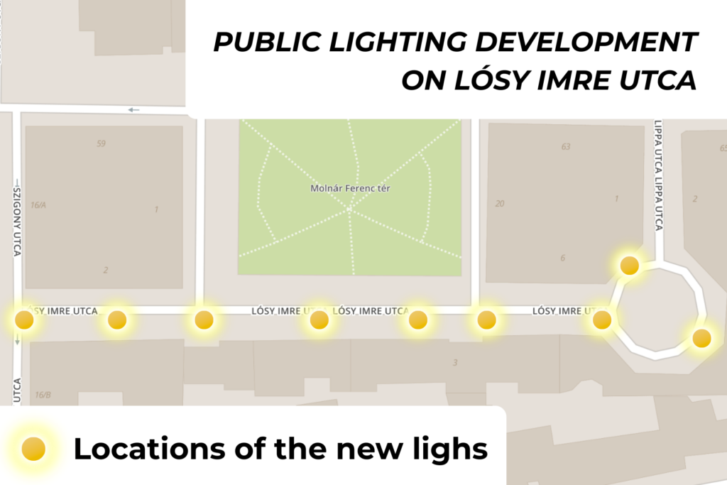 In the first quarter of 2026, public lighting upgrades will take place at four locations in the district: Lósy Imre utca, Füvészkert utca, Dugonics utca, and Teleki tér. The project on Lósy Imre utca will be the first to begin, with work starting on February 12, 2026.