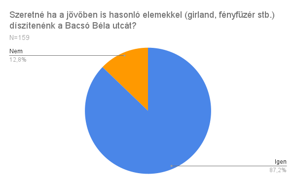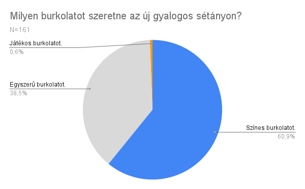 Rákérdeztünk, hogy a kitöltőknek vajon tetszett-e, hogy az elmúlt 2 évben színesre festettük az aszfaltot és feldíszítettük a sétányt. A többség tetszését elnyerte az ötlet, és a felújítás után is hasonló, színes útburkolatot szeretnének a Bacsó Béla utca új gyalogos sétányára.