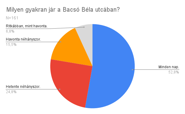 A Bacsó Béla utcáról szóló kérdőívet kitöltők megoszlása aszerint, hogy milyen gyakran járnak az utcában