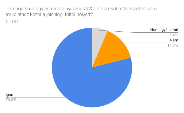 A kérdőívben arra is kíváncsiak voltunk, hogy a lakosok támogatnának-e egy automata üzemelésű nyilvános WC-t az utca Népszínház utca felőli végén, ahol most egy mobil WC üzemel. A válaszadók 79%-a támogatja, hogy legyen egy ilyen köztéri WC az utcában. Ugyanakkor más helyszíneket is javasoltak, mint például a Blaha Lujza tér, a József körút, vagy akár azt is el tudnák képzelni, hogy egy önkormányzati helyiséget nyilvános mosdóvá alakítsunk át. Ezeket a lehetőségeket megvizsgáljuk.