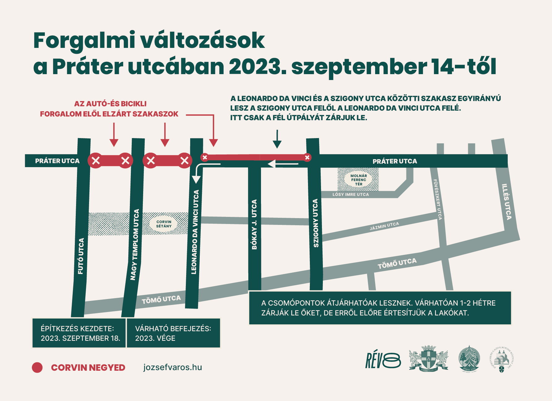 A Práter utcában a kivitelezés várhatóan 2023 végéig tart majd. Az építkezés során a Futó és a Leonardo da Vinci utca közötti szakaszt lezárjuk az autó– és bicikliforgalom elől, viszont a kereszteződések átjárhatóak maradnak. Ezeket az építkezés során le fogja zárni a kivitelező egy-két hétre, de erről előre értesítjük majd a lakókat.