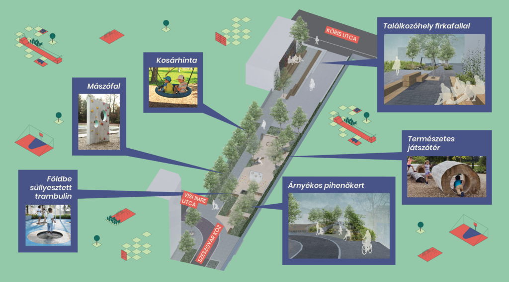 Az utca Kőris utca felőli részén jelenleg kihasználatlan terület helyén a kivitelezéseket követően egy árnyékos zöld sétány jön létre, ahol trambulin, mászófal és padok várják majd a városlakókat. A Szeszgyár utca további szakaszán pedig új fasort telepítünk, valamint felújítjuk az útpályát és a járdát is.