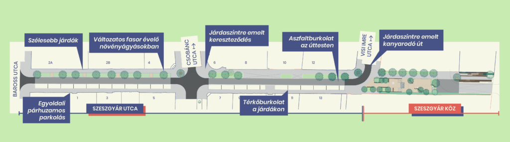 A Szeszgyár utca tervezése során az volt a fő szempont, hogy kényelmesebben lehessen sétálni az utcában, és árnyékosabb, zöldebb legyen. Ezért annyi fát telepítünk, amennyit a föld alatt futó közművek megengednek, a Baross utca felőli szakaszon pedig a fasor útjában lévő vízvezetéket is áthelyezzük, hogy itt is lehessen fákat telepíteni.