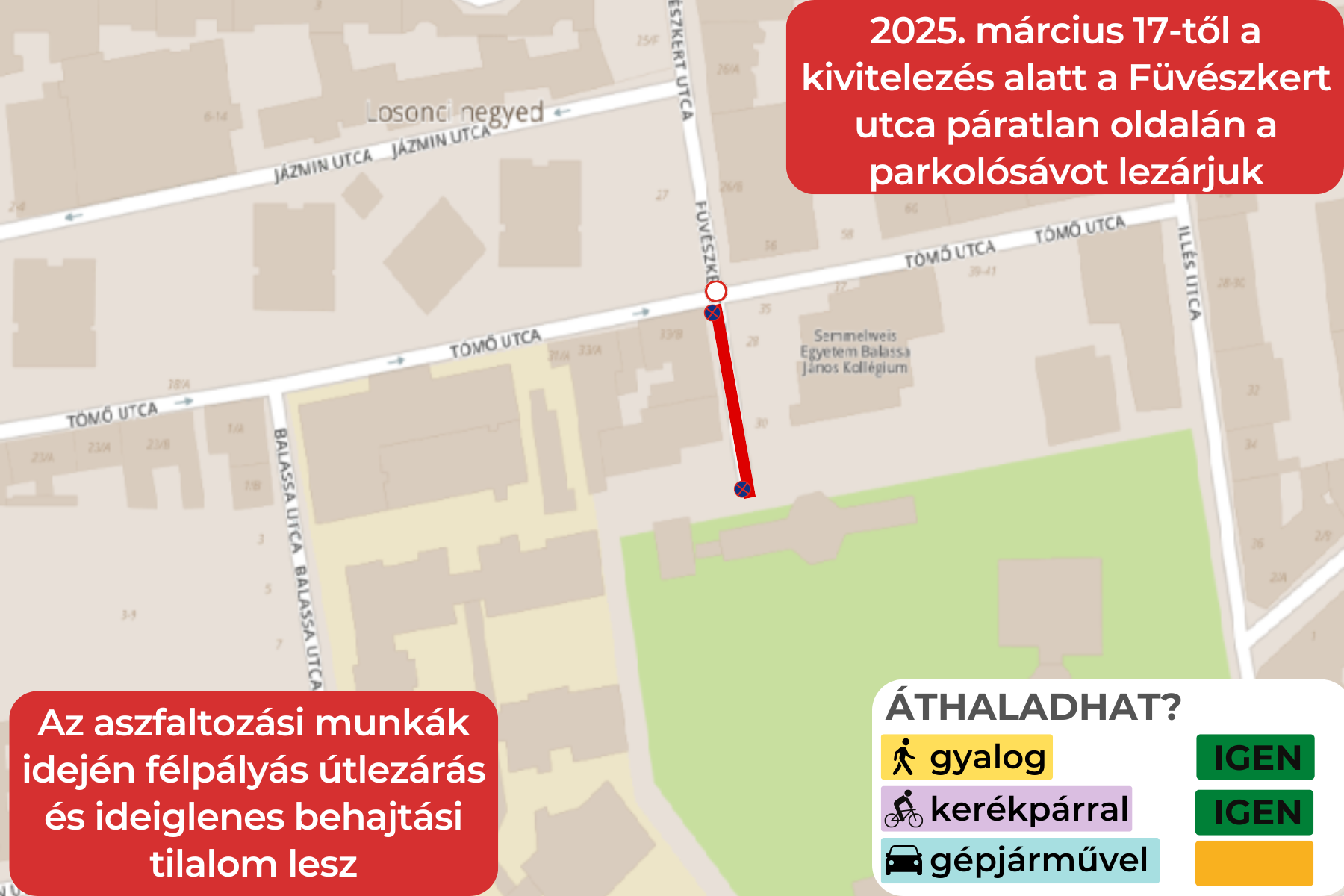 Ez idő alatt az ingatlanok előtti járdán megszűnik a parkolási lehetőség, a parkolóhelyeket a páros oldalra helyezik át.