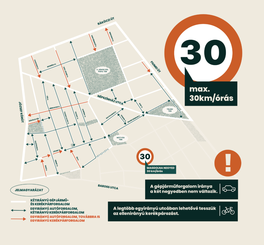 Márciusban a József körút, Rákóczi út, Fiumei út és Baross utca által határolt területen a Józsefvárosi Önkormányzat 30 km/órás sebességkorlátozást vezet be egy biztonságosabb, egészségesebb Józsefvárosért. Emellett a gépjárművek számára egyirányú utcákat megnyitjuk a kétirányú kerékpárforgalom előtt.