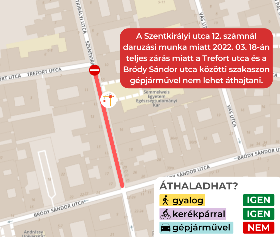 A Szentkirályi utca 12. szám alatti építkezés daruzási munkái miatt március 18-án, pénteken 1 napra lezárják az utcát a Trefort utca és a Bródy Sándor utca között, ezért a fenti időben gépkocsival nem tudnak itt áthaladni.
