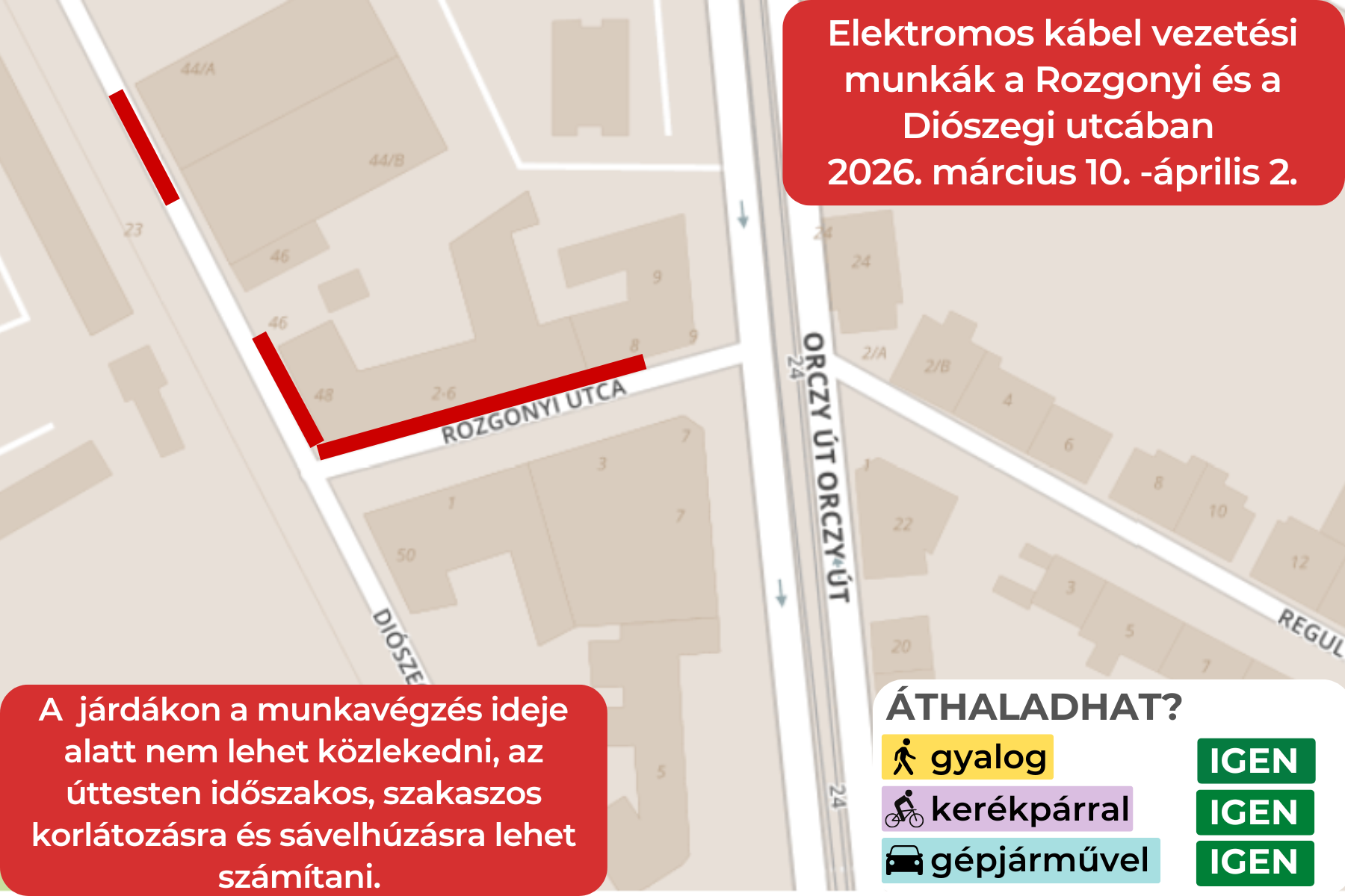 A páros oldali járdán ezért a munkavégzés ideje alatt nem lehet közlekedni. Az üzlethelyiségek megközelíthetőségét a kivitelező biztosítja.
