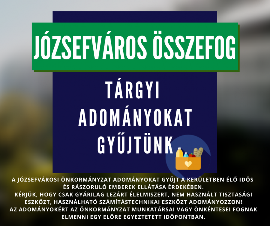 Utolsó frissítés: (Létrehozva: )Ha megteheti, ajánljon fel tárgyi adományt a Józsefvárosi Önkormányzatnak! Ha tud, ajánljon fel tárgyi adományt a Józsefvárosi Önkormányzatnak! A koronavírus-járvány okozta válság kapcsán a Józsefvárosi Önkormányzat adományokat gyűjt a kerületben élő idős és rászoruló emberek ellátása érdekében, hogy ki tudjuk elégíteni a megnövekedett igényeket. Kérjük, ha tudja támogatni erőfeszítéseinket, töltse ki ezt az űrlapot >>> […]