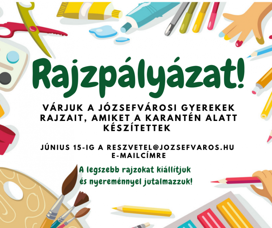 Utolsó frissítés: (Létrehozva: )A koronavírus tapasztalatai gyerekszemmel Azokat a rajzokat várjuk, amiket a kijárási korlátozás alatt készítettek a kerületi gyerekek. A legszebbeket kiállítjuk és nyereménnyel jutalmazzuk! A rajzokat 2020. június 15-ig a reszvetel@jozsefvaros.hu e-mail címre kérjük küldeni.