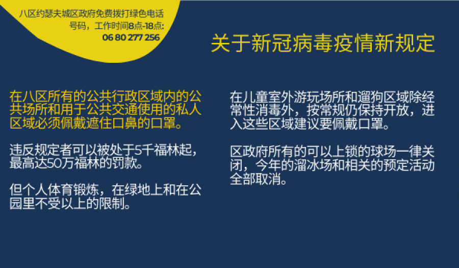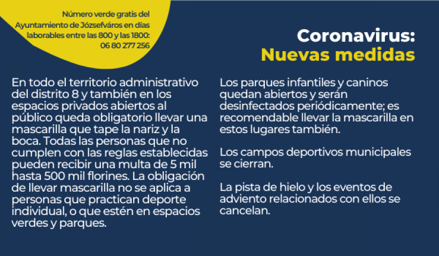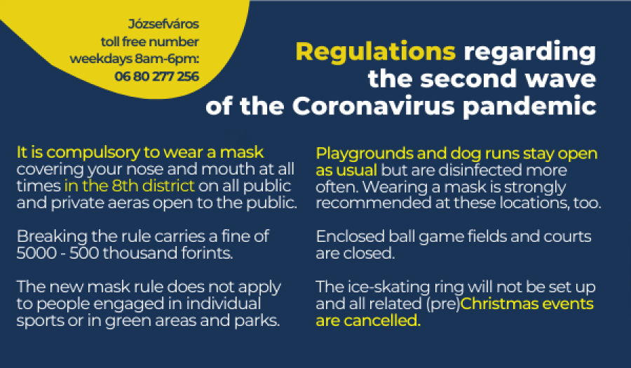 Utolsó frissítés: (Létrehozva: )请阅读我们的指南,了解如何佩戴口罩以及可以采取的其他预防措施。 在八区所有的公共行政区域内的公共场所和用于公共交通使用的私人区域必须佩戴遮住口鼻的口罩。 违反规定者可以被处于5千福林起,最高达50万福林的罚款。 但个人体育锻炼,在绿地上和在公园里不受以上的限制。 在儿童室外游玩场所和遛狗区域除经常性消毒外,按常规仍保持开放,进入这些区域建议要佩戴口罩。 区政府所有的可以上锁的球场一律关闭,今年的溜冰场和相关的预定活动全部取消。 出行禁令:晚上8点和凌晨5点之间实行出行禁令。只有上班和下班回家的情况以及特殊情况下可以豁免。遛狗者可以无时间限制地外出遛狗,但离居住地不得超过500米的范围内。 一般性大型活动禁令:所有的大型活动都被禁止。体育比赛只能闭门举行。在户外允许个人体育锻炼,但是业余性的群体运动项目被禁止。酒店只能接待商业目的旅行的客人,游客不能接待。 所有的集会被禁止:饭店关闭,只能提供送餐服务,工作单位的食堂可以开放。商店,理发店和其他的小型服务业晚上7点关门。婚礼在没有宴请的情况下可以举行。葬礼的参加人数不能超过50人。家庭聚会不能超过10人。 八年级以上的中学和大学实行远程教学,学生宿舍关闭。托儿所,幼儿园和对14岁以下人员的小学继续开放。 免费停车:在公共区域停车地段的车辆不必支付停车费用。 八区约瑟夫城区政府 工作日绿色电话号码 8-18 点之间: 06 80 277 256 facebook.com/jozsefvaros facebook.com/groups/jozsefvarososszefog 匈牙利政府官方指南 koronavirus.gov.hu facebook.com/koronavirus.gov.hu nnk.gov.hu 绿色电话号码:06 80 277 455, 06 80 277 456