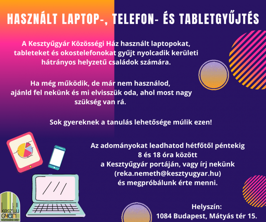 Utolsó frissítés: (Létrehozva: )A Kesztyűgyár Közösségi Ház azoknak gyűjt, akik nehezített körülmények között indultak neki az online oktatásnak. Az általános iskolák nem zártak be, de sokan így is arra kényszerülnek, hogy otthon maradjanak, a középiskolásokról nem is beszélve. Tudjuk, hogy sokan nehezített körülményekkel indultak neki az online oktatásnak, így ezúttal nekik is szeretnének segíteni. Éppen ezért használt laptopokat, […]