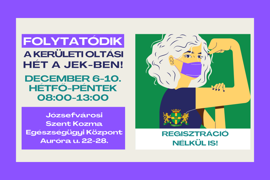 Utolsó frissítés: (Létrehozva: )2022 januárban előzetes időpontfoglalás és regisztráció nélkül kaphat oltást a kórházi oltópontokon, a Józsefvárosi Szent Kozma Egészségügyi Központban és a kerületi háziorvosoknál is. Az Országos Oltási Munkacsoport döntése alapján 2022. januárban minden csütörtökön, pénteken és szombaton oltási akciónapok lesznek a kórházi oltópontokon és a Józsefvárosi Szent Kozma Egészségügyi Központban, valamint kijelölt napokon a kerületi háziorvosoknál […]