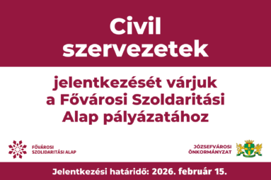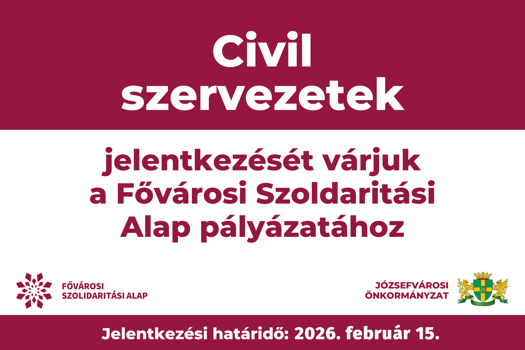 Utolsó frissítés: (Létrehozva: 2026.01.09.)A Fővárosi Szolidaritási Alap pályázatot tett közzé a Fővárosi Közgyűlés által meghatározott társadalompolitikai célok előmozdítását szolgáló pályázatok támogatására, amelyhez a Józsefvárosi Önkormányzat várja a pályázaton indulni kívánó civil szervezetek megkereséseit. 2026. január 7-én hirdették ki a Fővárosi Szolidaritási Alap idei pályázatát, amelyen akár 80 millió forint támogatás nyerhető szociális feladatokra. A rendelkezésre álló keretösszeg összesen […]